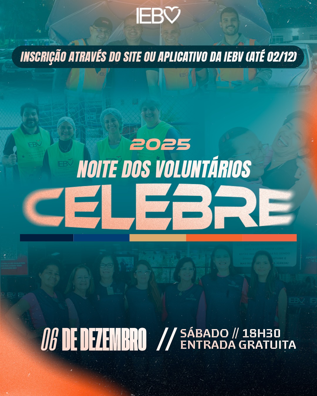 CELEBRE 2025 - NOITE DOS VOLUNTÁRIOS DIA 06 DE DEZEMBRO, SÁBADO ÀS 18H30 ENTRADA GRATUITA Um evento direcionado aos nossos amados voluntários! Faça a sua inscrição e venha desfrutar de caldos deliciosos e um tempo de comunhão! Entrada gratuita! CLIQUE AQUI E FAÇA A SUA INSCRIÇÃO!